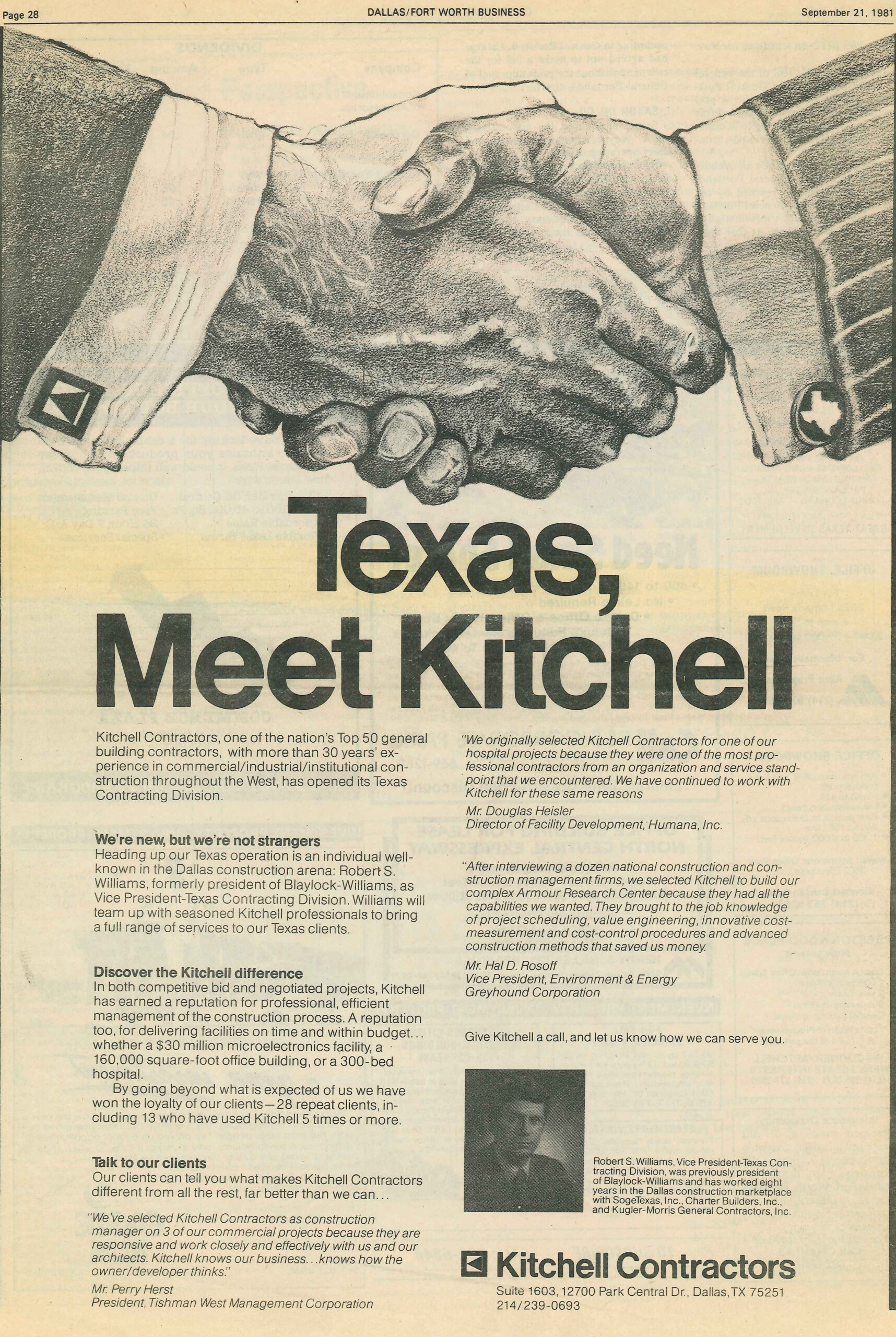 In 1981, Kitchell opened a new office in Texas, marking a renewed focus on growth in the region. With bold energy and creativity, we announced this commitment through ads as striking as the opportunities ahead. The full ads that captured this spirit are shown below.