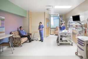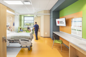 On the Thomas Campus, a 94,000-square-foot office building did exactly that. By relocating nonclinical teams into a modern, light-filled workspace, Phoenix Children’s unlocked the potential to add nearly 100 new inpatient beds and expand family spaces in the main tower.